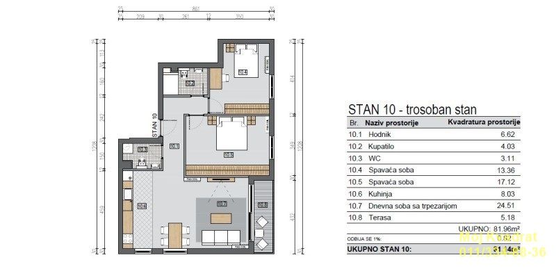 U lameli 2 nalazi se trosoban stan sa dnevnom sobom, trpearijom, kuhinjom, dve spavaće sobe, dva mokra čvora i terasom.
