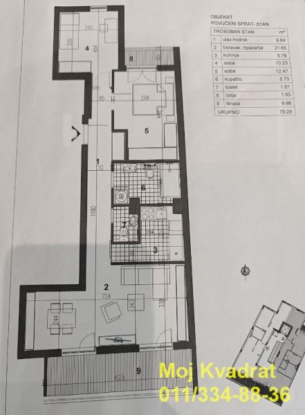 Sastoji se od ulaznog hodnika, dnevne sobe sa trpezarijom, odvojene kuhinje, dve spavaće sobe, kupatila, toaleta, lođe i trerase.