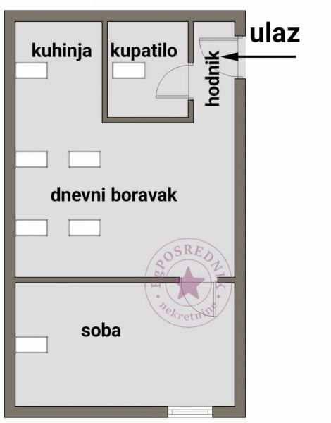 Sastoji se od ulaznog hodnika, dnevno-trpezarijskog dela, kuhinje, spavaće sobe i kupatila.