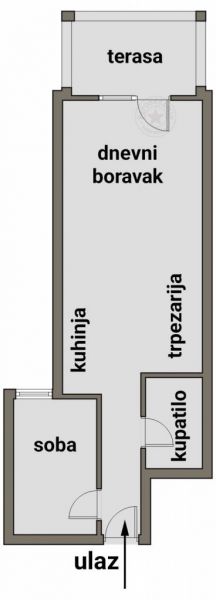 Stan se sastoji od prostranog dnevnog boravka sa kuhinjom, spavaće sobe, kupatila i terasa sa tendom.
