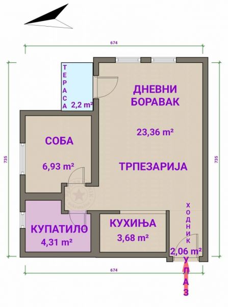 Sastoji se iz ulaznog hodnika, dnevnog boravka sa trpezarijom i kuhinjom kao otvorenim prostorom iz kojeg se izlazi na terasu, spavaće sobe i kupatila.