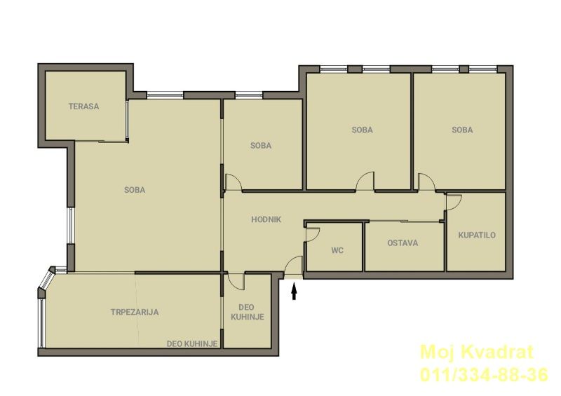 Sastoji se od ulaznog hodnika, dnevne sobe iz koje se izlazi na terasu, kuhinje sa trpezarijom, odvojenog spavaćeg dela sa tri sobe, kupatila, toaleta i ostave.
