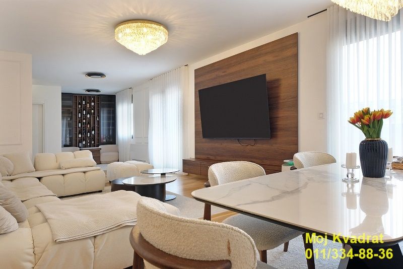 Stan poseduje prostran dnevni boravak, četiri spavaće sobe (jedna je luksuzni garderober), dva kupatila i dve terase, uz enterijer od mermera, parketa prve klase i luksuznog nameštaja.