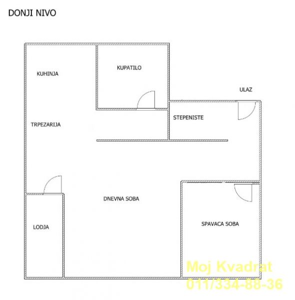 Donji nivo: hodnik, dnevnotrpezarijski deo povezan sa kuhinjom koja je vizuelno odvojena, spavaća soba, kupatilo