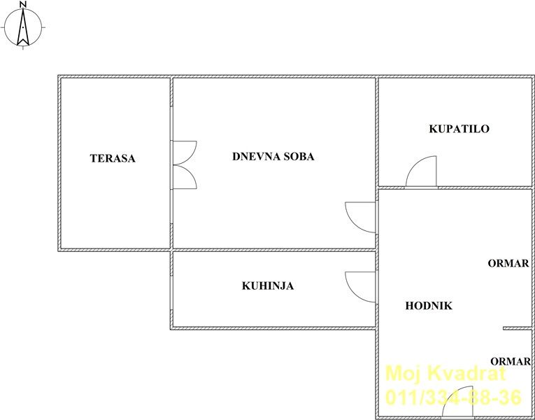 Sastoji se od ulaznog hodnika, prostrane dnevne sobe sa trpezarijom, odvojene kuhinje, kupatila i terase.