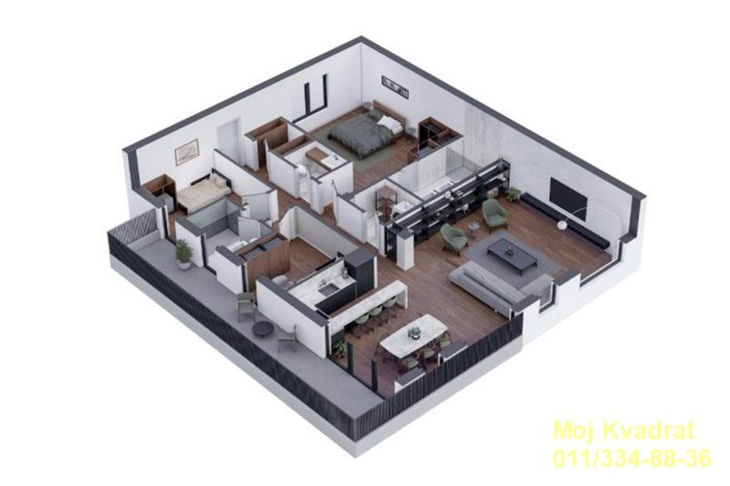 Prostorije: prostran (58m2) dnevni boravak sa kuhinjom i trpezarijom (open space), glavna spavaća soba (23m2) sa sopstvenim kupatilom, dve manje sobe, kupatilo, garderober, vešernica, toalet i velika terasa.