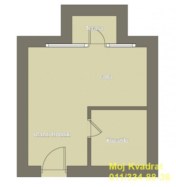 Prostorije: ulazni hodnik, soba, kupatilo i terasa.