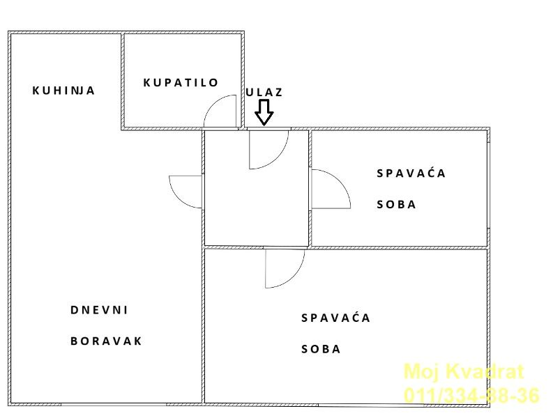 Prostorije: prostran dnevni boravak, dve spavaće sobe, kuhinja sa trpezarijom, kupatilo. Praktičan raspored prostorija omogućava ugodan boravak.