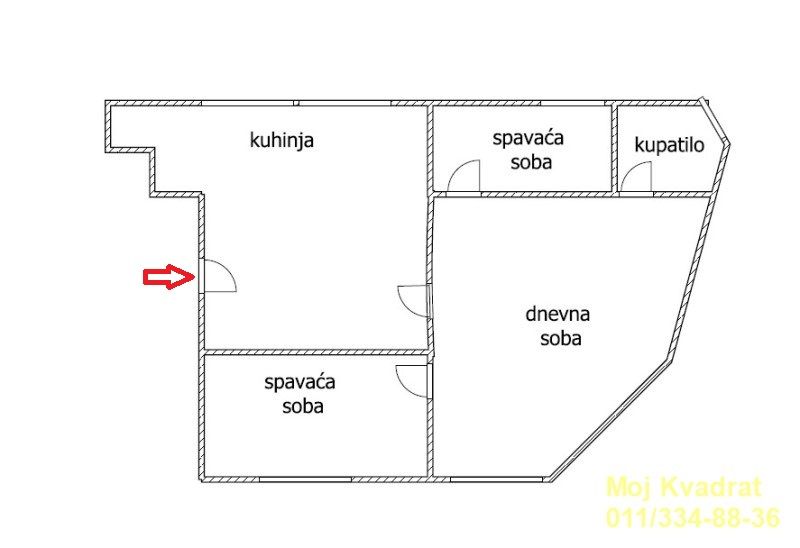 Prostorije: dnevna soba, kuhinja, dve spavaće sobe i kupatilo.