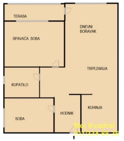 Sastoji se od prostranog dnevnog boravka sa trpezarijom, izdvojene kuhinje, dve spavaće sobe, kupatila, hodnika i terase.
